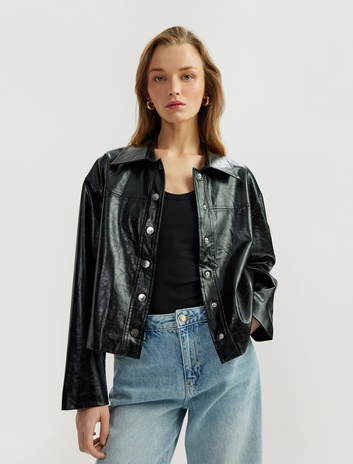 Çıtçıt Düğme Detaylı Uzun Kollu Cepli Kruvaze Suni Deri Ceket