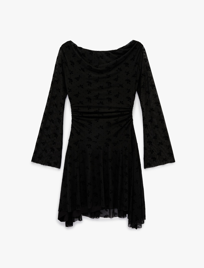 Slim Fit Uzun Kollu Drape Detaylı Degaje Yaka Çiçekli Tül Mini Elbise Sepete Ekle