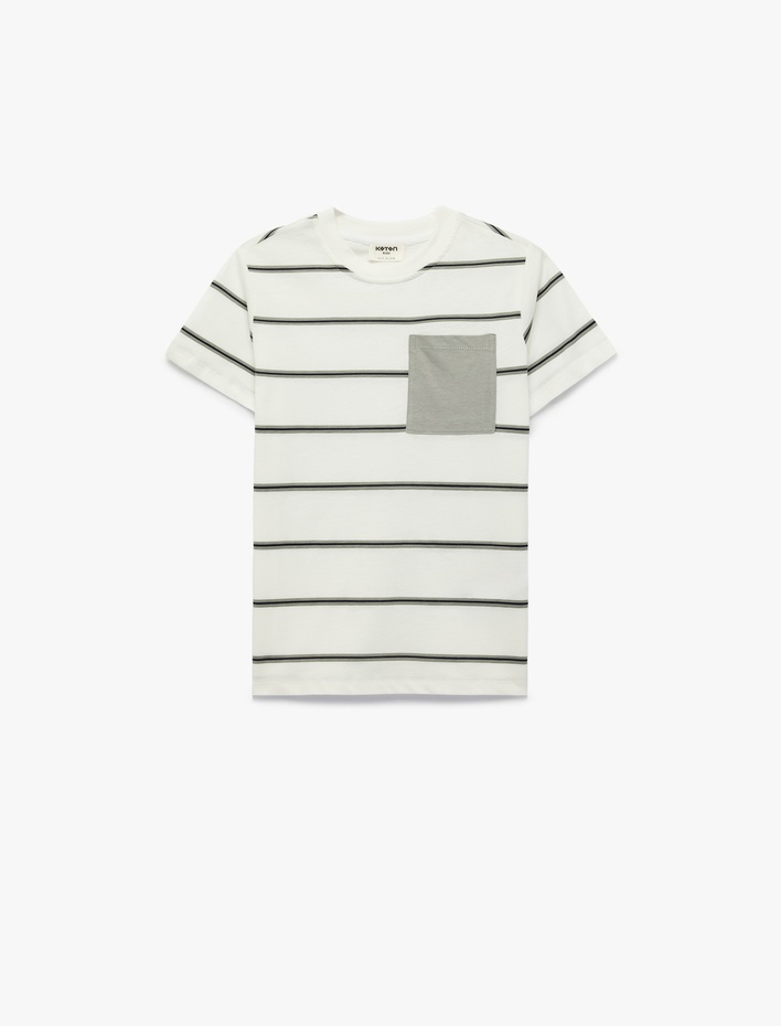 Pamuklu Cep Detaylı Kısa Kollu Bisiklet Yaka Çizgili Tişört Sepete Ekle