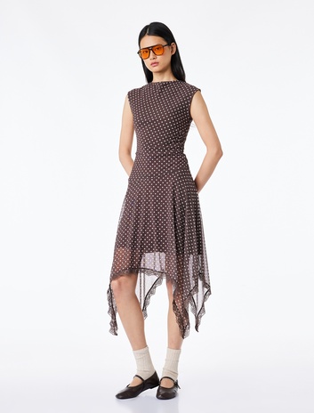 Kolsuz Bisiklet Yaka Büzgülü Asimetrik Midi Puantiyeli Tül Elbise Sepete Ekle