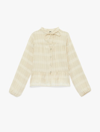 Keten Karışımlı Uzun Balon Kollu Yuvarlak Bağcıklı Yaka Bluz