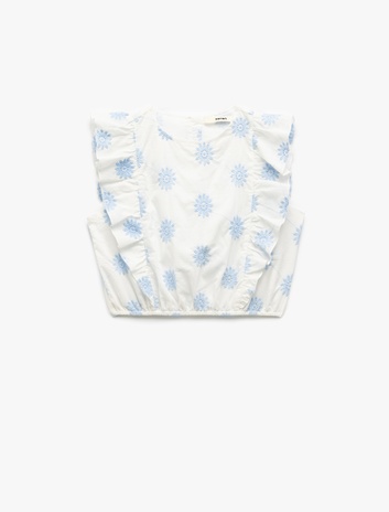 Pamuklu Kolsuz Bisiklet Yaka Aplike Çiçek Detaylı Bluz Sepete Ekle