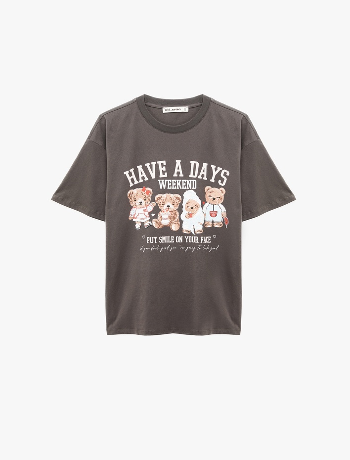 Kısa Kollu Bisiklet Yaka Ayıcık Baskılı Oversize Tişört Sepete Ekle