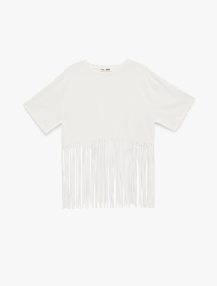 Pamuklu Püskül Detaylı Kısa Kollu Bisiklet Yaka Oversize Crop Tişört Sepete Ekle