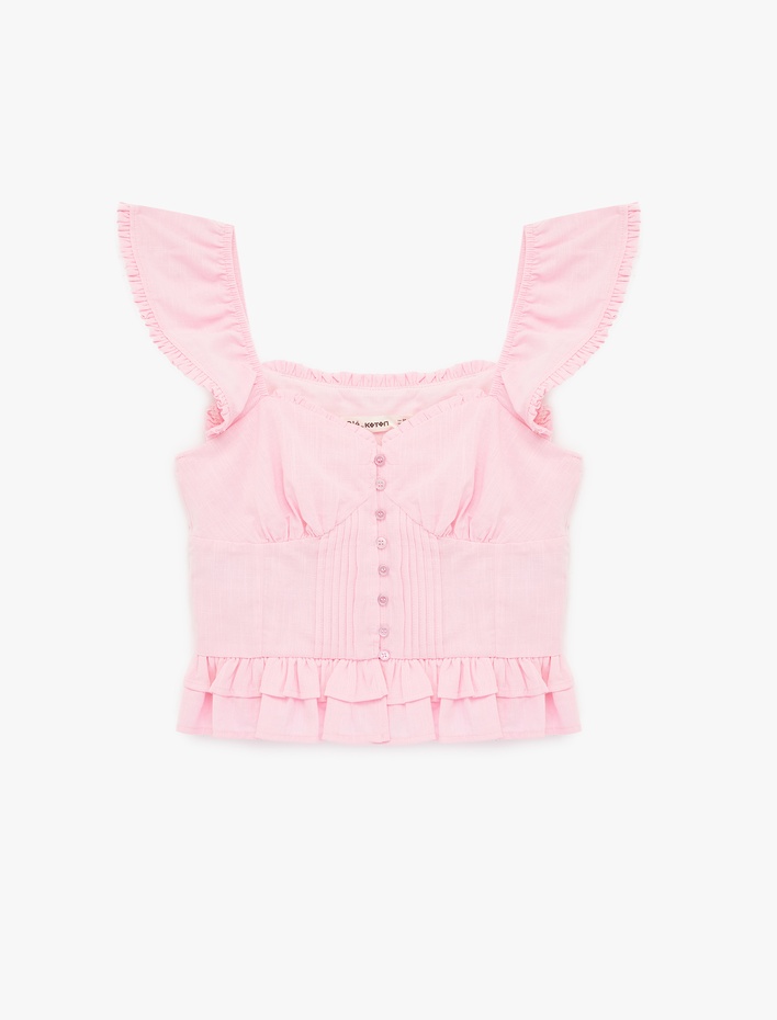 Pamuklu Düğmeli Fırfırlı Volanlı Kalp Yaka Kolsuz Bluz Sepete Ekle