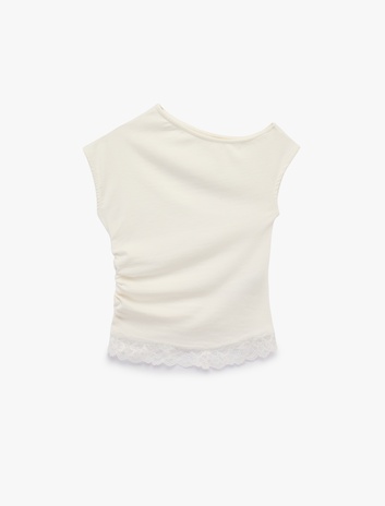 Dantel Detaylı Kısa Kollu Asimetrik Yaka Drapeli Omzu Açık Tişört Sepete Ekle