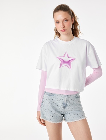 Pamuklu Kısa Kollu Bisiklet Yaka Yıldız Baskılı Crop Tişört Sepete Ekle