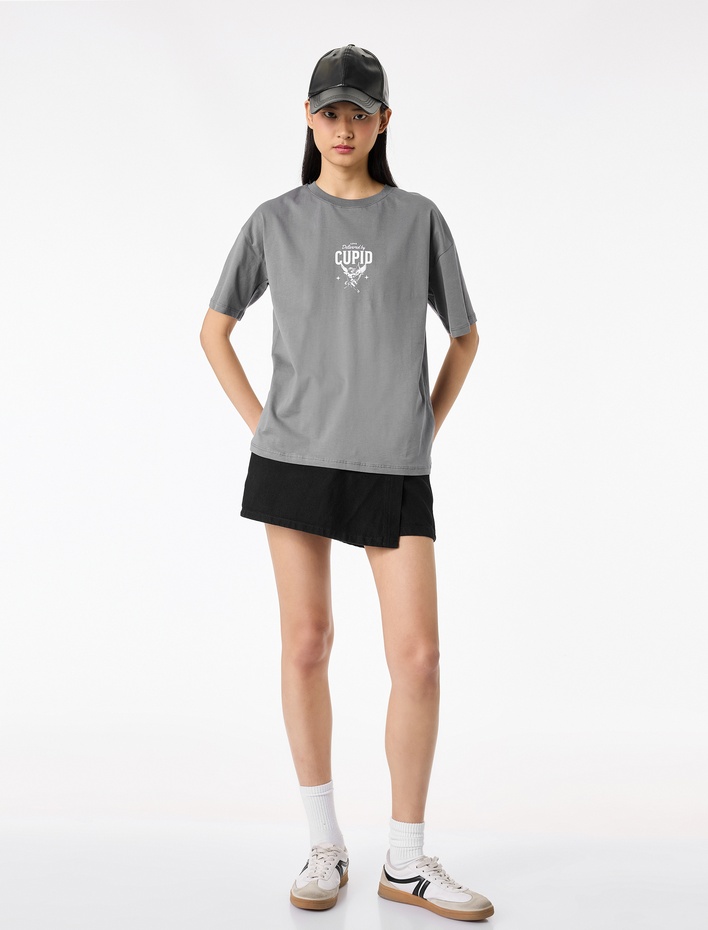 Rahat Kalıp Kısa Kollu Bisiklet Yaka Baskılı Tişört Sepete Ekle