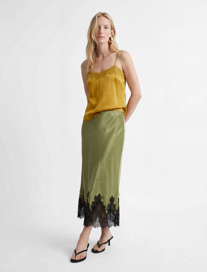Yüksek Bel Dantel Detaylı Uzun Saten Etek Sepete Ekle
