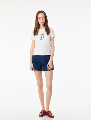 Slim Fit Kısa Kollu Bisiklet Yaka Pamuklu Fiyonklu Çilek Baskılı Tişört Sepete Ekle