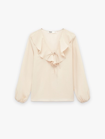 İpli Volan Detaylı Uzun Kollu V Yaka Bluz