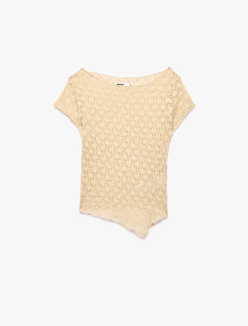 Slim Fit Kayık Yaka Kısa Kollu Yarı Transparan Asimetrik Dantel Tişört