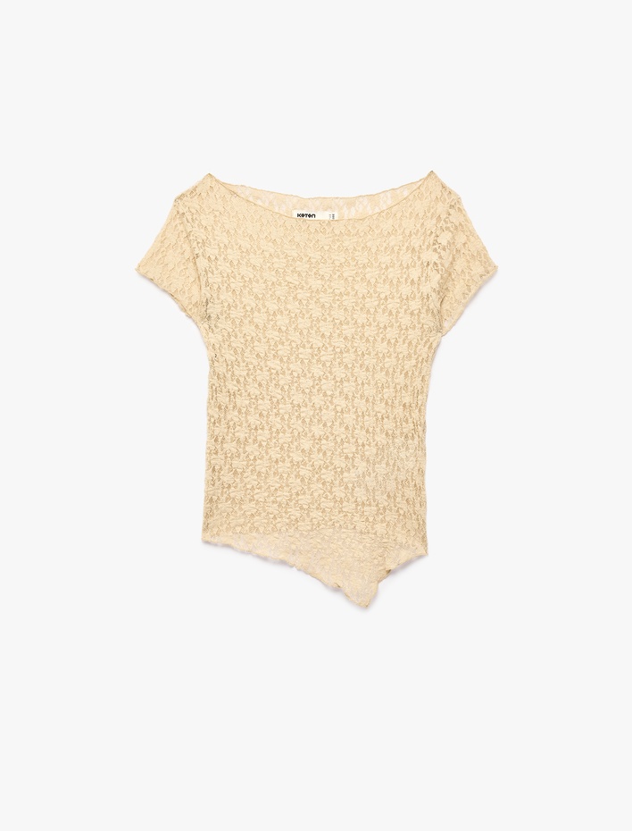 Slim Fit Kayık Yaka Kısa Kollu Yarı Transparan Asimetrik Dantel Tişört Sepete Ekle