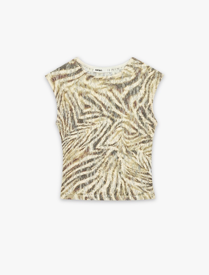 Slim Fit Yarı Transparan Bisiklet Yaka Kolsuz Desenli Dantelli Bluz