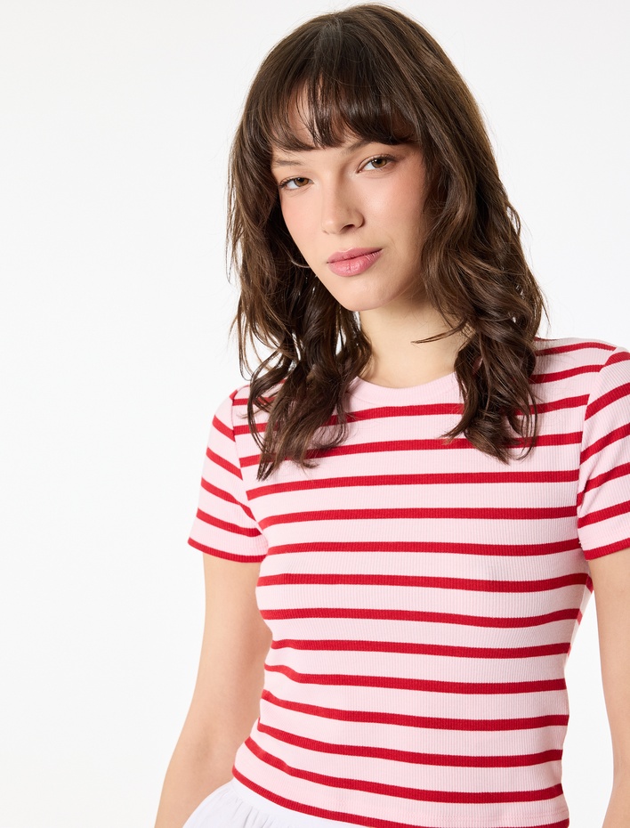 Slim Fit Viskon Karışımlı Kısa Kollu Bisiklet Yaka Çizgili Tişört Sepete Ekle