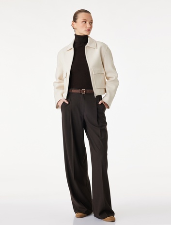 Uzun Kollu Cepli Fermuarlı Crop Kaşe Ceket