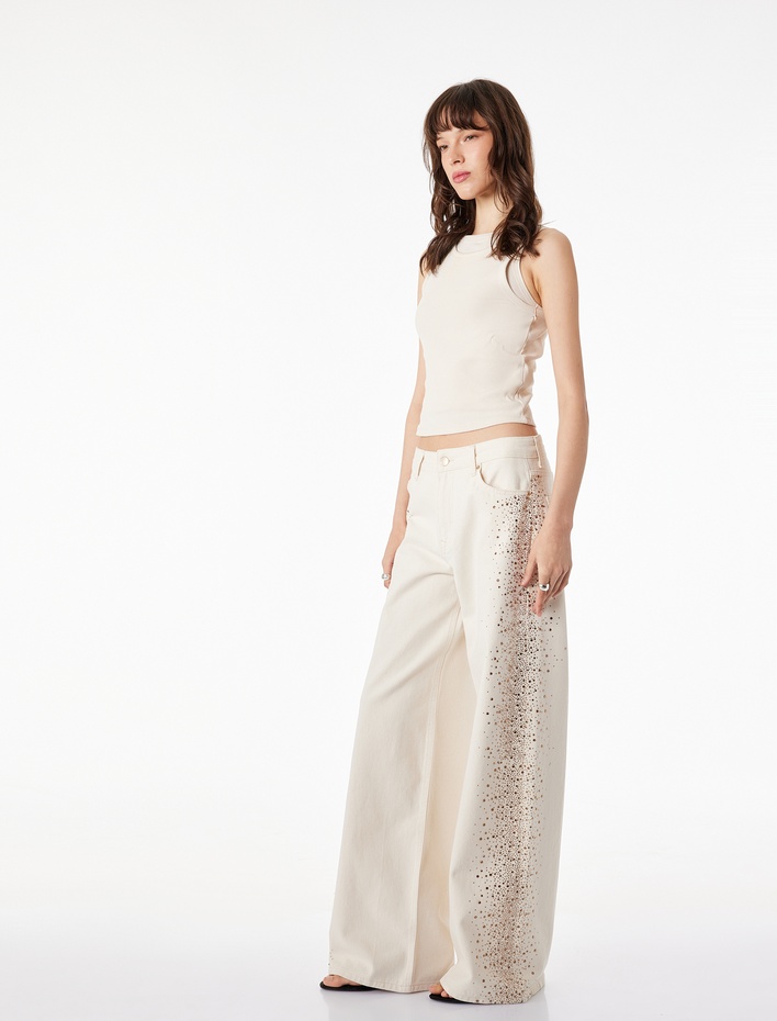 Cepli Taş Detaylı Geniş Paça Denim Pantolon - Wide Leg Jeans