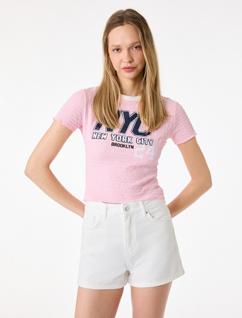 Slim Fit Kısa Kollu Bisiklet Yaka Bürümcük Baskılı Tişört Sepete Ekle