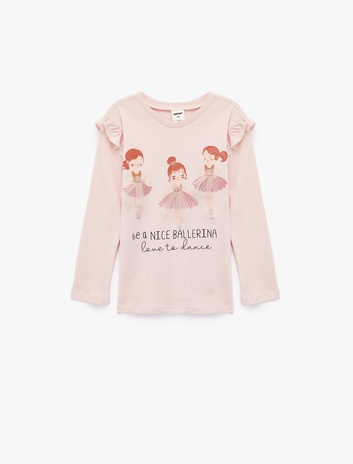 Kız Bebek Balerin Baskılı Uzun Kollu Bisiklet Yaka Pamuklu Tişört