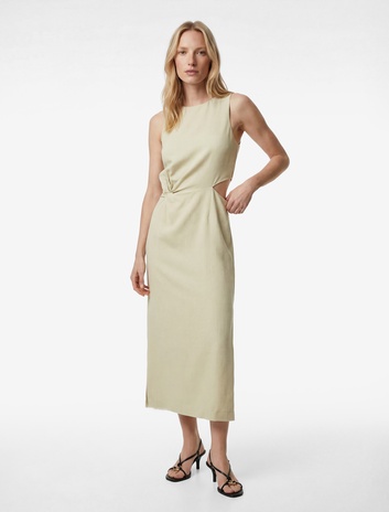 Keten Görünümlü Slim Fit Bisiklet Yaka Kolsuz Pencere Detaylı Midi Elbise Sepete Ekle
