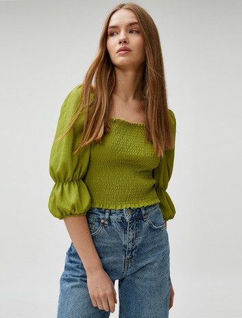 Crop Tişört Gipeli Balon Kollu Kare Yaka Bürümcük Sepete Ekle