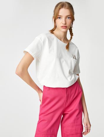 Pamuklu Tişört Kısa Kollu Bisiklet Yaka Cep Detaylı Nakışlı Sepete Ekle