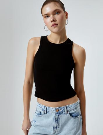 Slim Fit Viskon Kumaş Bisiklet Yaka Fitilli Kolsuz Tişört