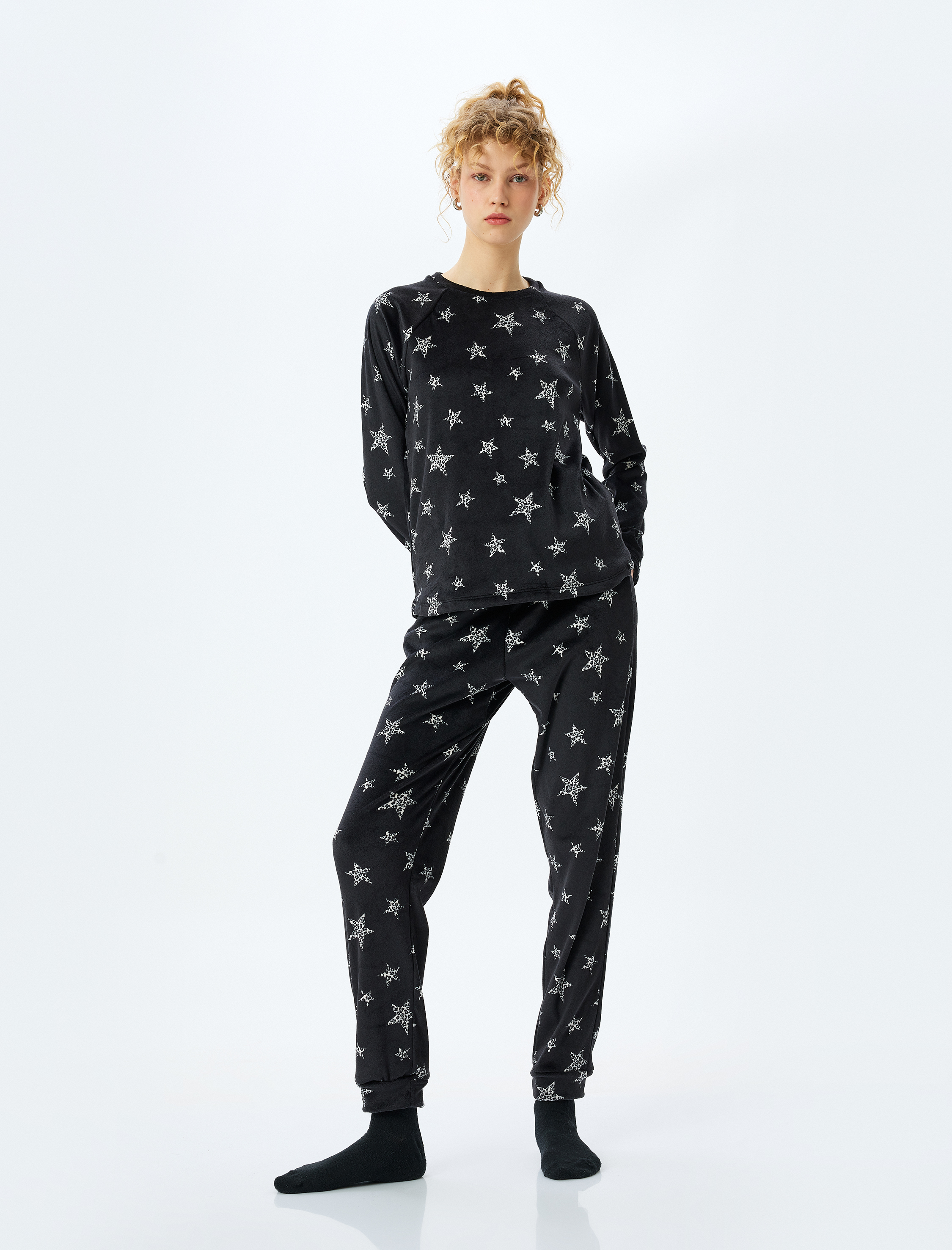 Yıldız Desenli Uzun Kollu Polar Kadife Pijama Üstü