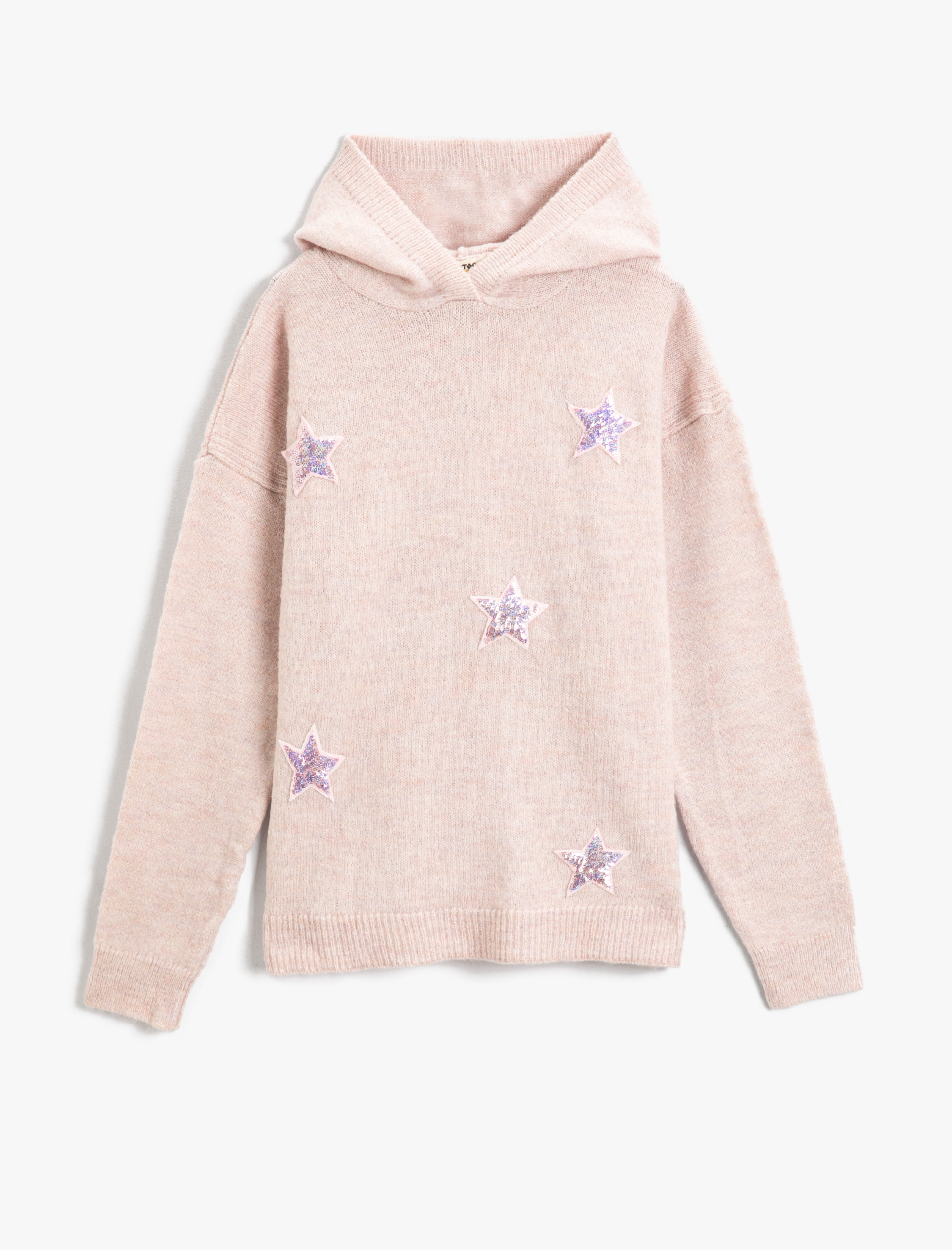 Kız Çocuk Yıldız Pul Payet İşlemeli Kapşonlu Tiriko Uzun Kollu Kazak