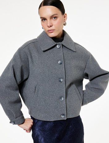 Düğmeli Cepli Uzun Kollu Kruvaze Kısa Kaşe Ceket Sepete Ekle