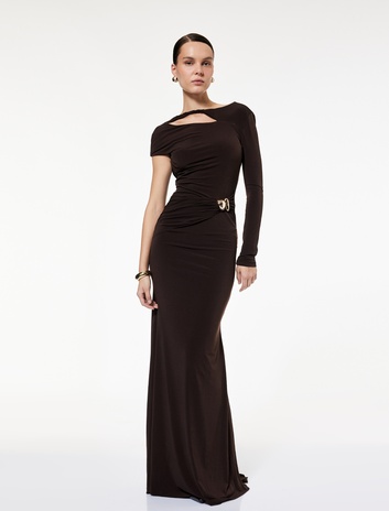 Uzun Kollu Metal Aksesuarlı Sırtı Pencere Detaylı Uzun Tek Omuz Elbise Sepete Ekle