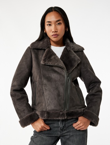 Cepli Fermuarlı Uzun Kollu Peluş Yaka Süet Görünümlü Crop Biker Ceket Sepete Ekle