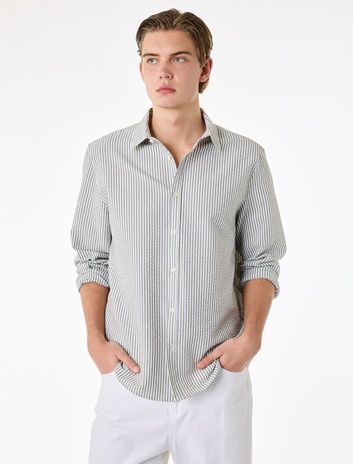 Regular Fit Viskon Karışımlı Düğmeli Gömlek Yaka Çizgili Uzun Kollu Gömlek