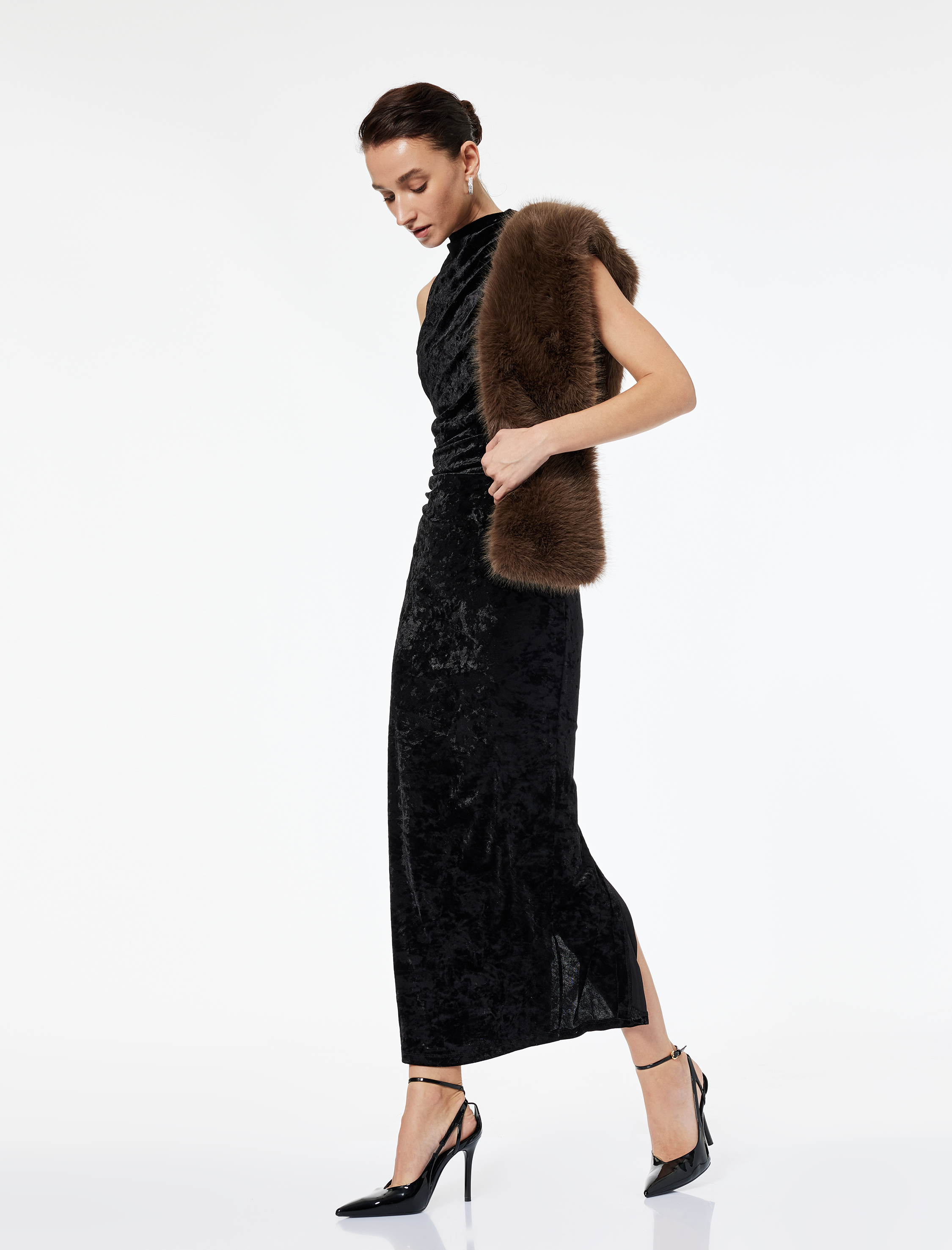 Yırtmaç Detaylı Drapeli Kolsuz Hafif Dik Yaka Dokulu Uzun Kadife Kalem Elbise