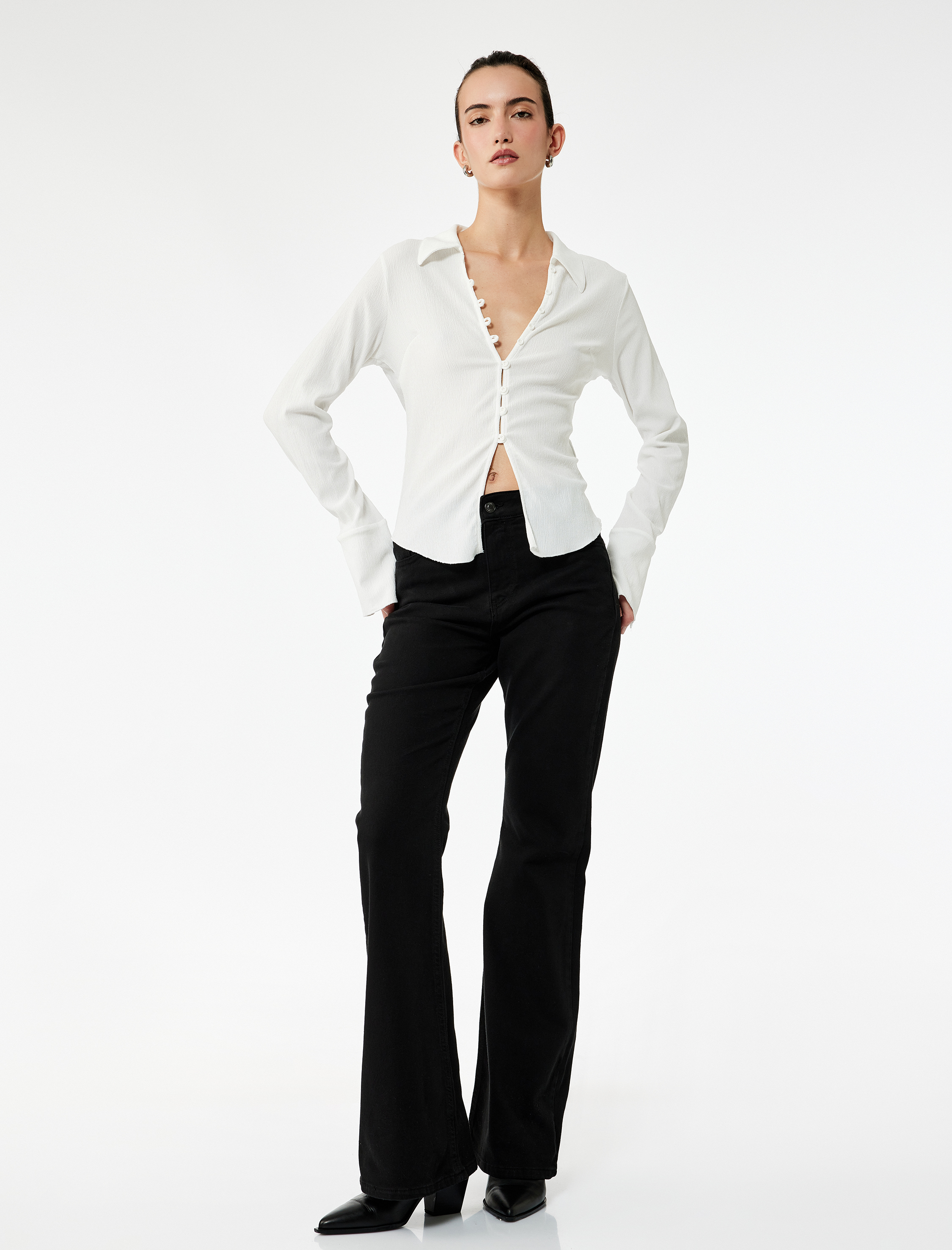 <p><p>Yüksek bel, İspanyol paça jean pantolon modern stili konforla birleştiriyor. Beş cep detayı ve oturan kalıbıyla hem şıklık hem de rahatlık sunuyor. Dar kesimi ile vücut hatlarını zarif bir şekilde öne çıkarırken, paça yapısı sayesinde farklı ayakkabılarla kolayca kombin edilebiliyor. Pamuklu yapısı sayesinde gün boyu rahat bir kullanım sağlıyor.</p></p> <strong>Stil Önerisi</strong> <p><p>Pantolonu basic bir tişört ve sneakerlarla günlük bir tarzda kombinleyebilirsiniz. Daha şık bir görünüm için, topuklu ayakkabılar ve ince bir üstle tamamlayarak ofis şıklığı yaratabilirsiniz. Serin akşamlar için üzerinize alacağınız hafif bir ceket, görünümünüze ekstra bir dokunuş katacaktır.</p></p> <strong>Ürün Özellikleri</strong> <p>Bel Tipi: Yüksek Bel<br>Cep Tipi: 5 Cep<br>Fit: Dar Kalıp<br>Paça Tipi: Normal Paça<br>Kumaş: %99 Pamuk, %1 Elastan<br>Kullanım Alanı: Günlük Giyim, Ofis Giyim</p> <p>Koton pantolon koleksiyonuyla şıklığı ve konforu bir arada yaşayın! Her stile uyum sağlayacak seçenekleri keşfedin!</p> <p></p> <p></p>