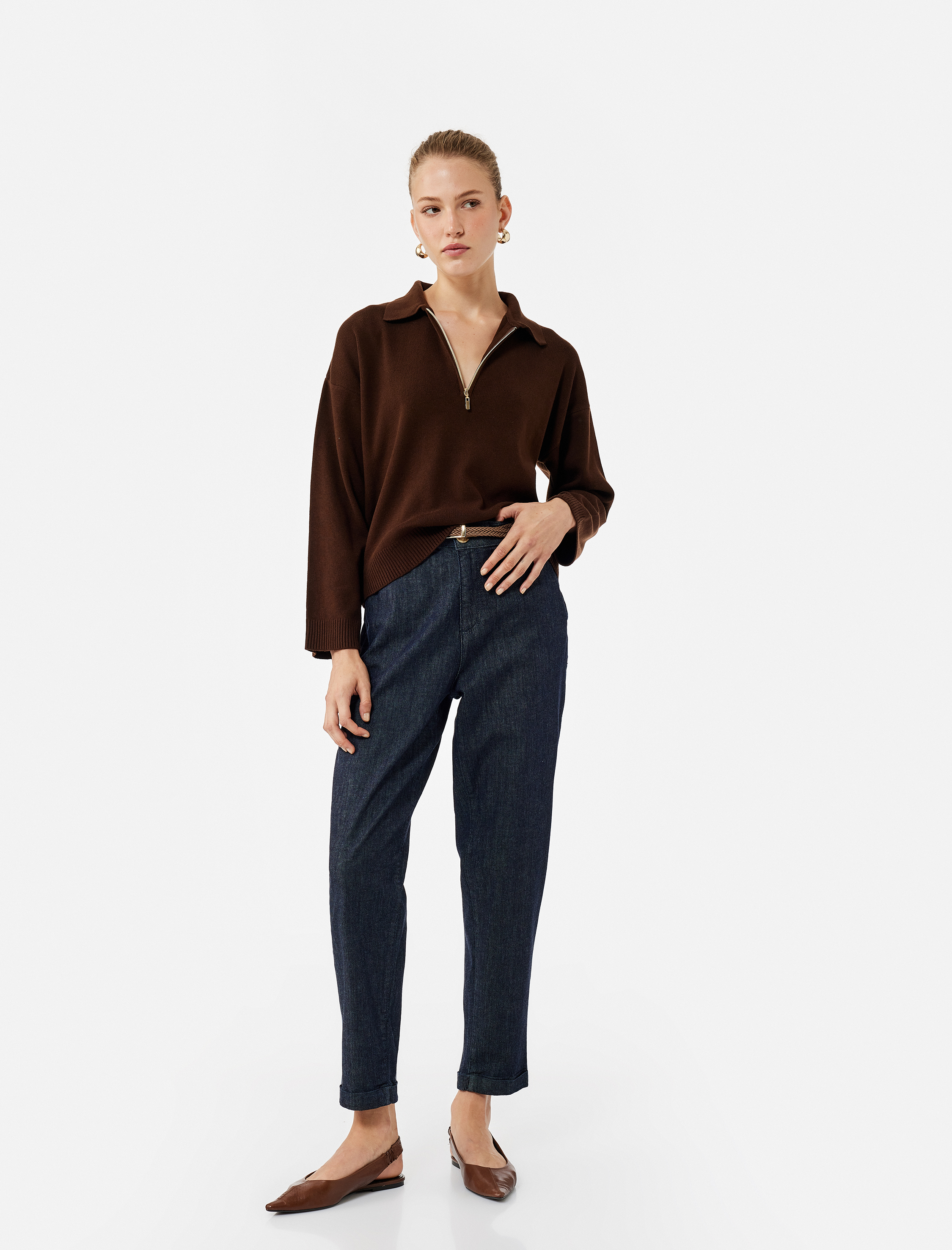 <p><p>Rahat kalıp yüksek bel pantolon, şıklığı ve konforu bir arada sunuyor. Yumuşak pamuklu dokusu sayesinde rahat bir giyim deneyimi sağlayan pantolon, hareket özgürlüğünü destekliyor. Yüksek beli ve kemerli tasarımı ile şık kombinler yaratmanıza olanak tanıyan pantolon hem günlük hem de ofis stilinizin vazgeçilmez bir parçası olmaya aday.</p></p> <strong>Stil Önerisi</strong> <p><p>Yüksek bel pantolonunuzu, ince bir bluz ve ince bir ceketle kombinleyerek ofis için şık bir görünüm elde edebilirsiniz.Ayrıca minimalist takılar ve bir clutch çanta ile akşam davetlerinde tarzınızı öne çıkarabilirsiniz.</p></p> <strong>Ürün Özellikleri</strong> <p><p>Bel Tipi: Yüksek Bel<br>Fit: Rahat Kalıp<br>Kumaş: %98 Pamuk, %2 Elastan<br>Siluet: Cigarette<br>Kullanım Alanı: Günlük Giyim, Ofis Giyim</p></p> <p>Koton’un pantolon tasarımı ile şıklığınızı her ortamda yansıtın. Koton koleksiyonları ile stilinize modern bir dokunuş katın!</p> <p>İndigo Ürün Kullanım Bilgisi: Ürünümüzde kullanılan indigo boya, kullanım esnasında giysilerinize bir miktar renk verebilir. İlk yıkama tersten ve tek başına, sonraki yıkamalarda ise yine tersten ve renkli çamaşırlar ile birlikte yıkamanızı tavsiye ederiz.</p> <p></p>