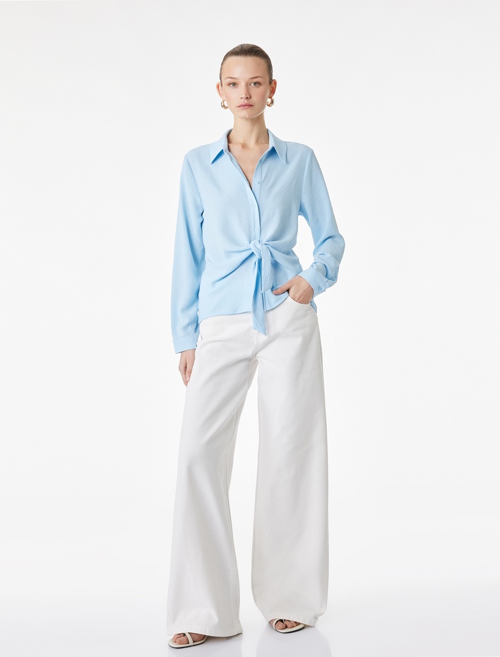 Uzun Kollu Düğmeli Bağlama Detaylı Gömlek