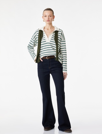 Uzun Kollu Polo Yaka Çizgili Oversize Triko Kazak