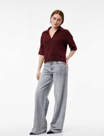 Kısa Kollu Pullu Parıltılı Polo Yaka Triko Kazak