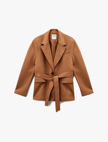 Uzun Kollu Düğmeli Cepli Kemerli Süet Görünümlü Ceket