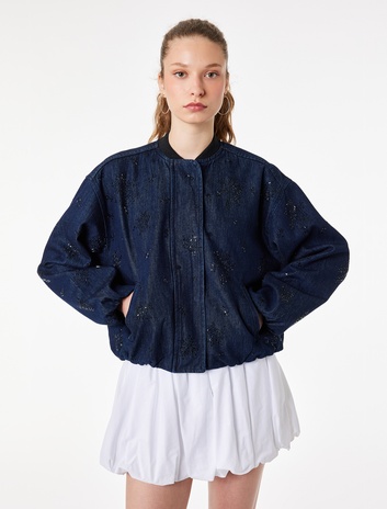 Taş Detaylı Uzun Kollu Düğmeli Yuvarlak Yaka Denim Ceket