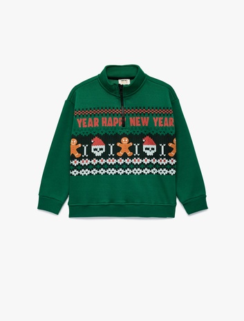 Şardonlu Uzun Kollu Yılbaşı Temalı Yarım Fermuarlı Dik Yaka Baskılı Yılbaşı Sweatshirt Sepete Ekle