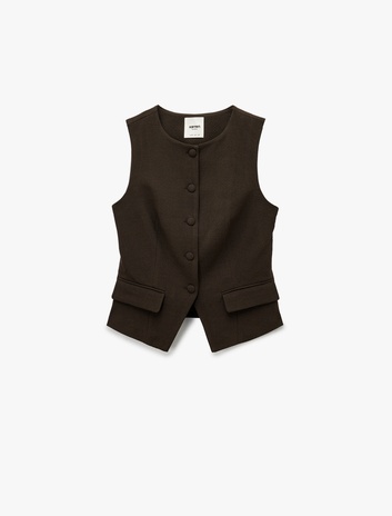 Viskon Karışımlı Cep Detaylı Bisiklet Yaka Düğmeli Kolsuz Yelek