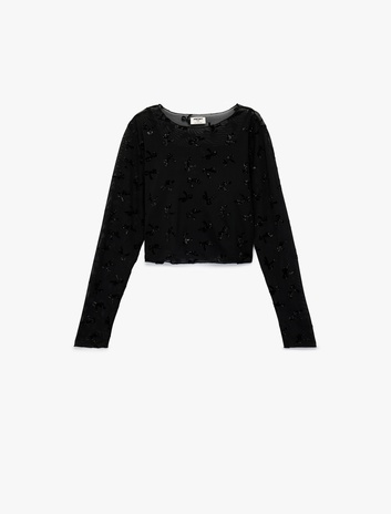Uzun Kollu Simli Fiyonk Detaylı Tül Bisiklet Yaka Crop Bluz Sepete Ekle