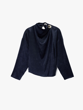 Metal Aksesuarlı Asimetrik Yaka Uzun Kollu Dokulu Saten Bluz