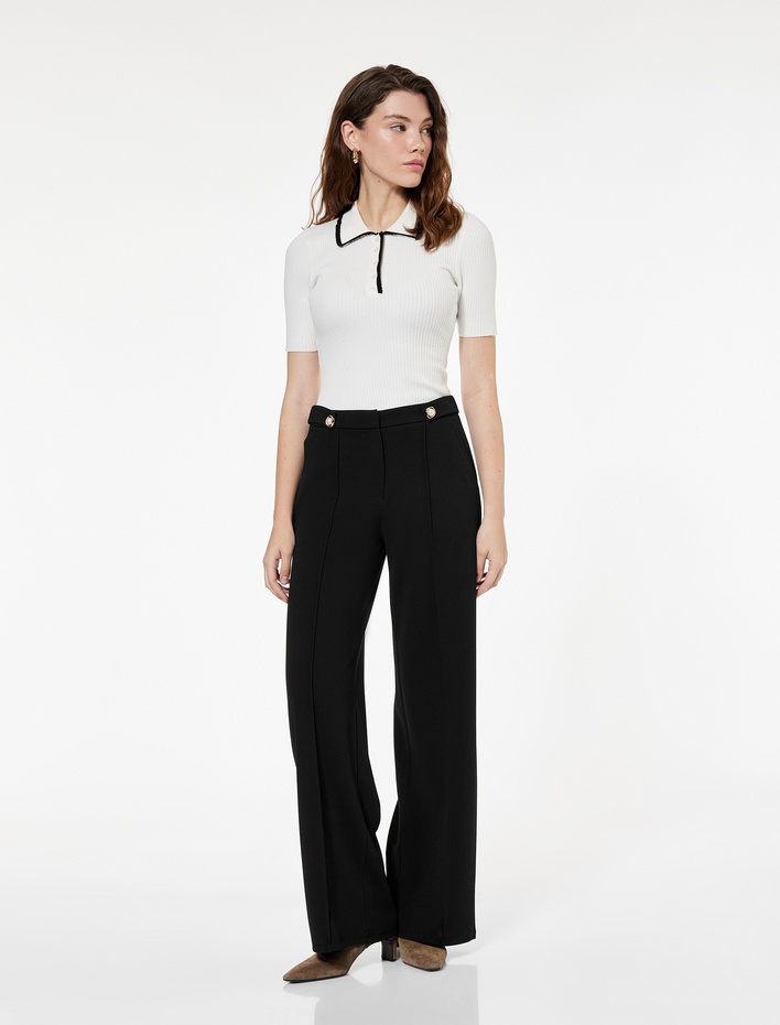 Düğme Detaylı Cepli Düz Bol Paça Kumaş Pantolon