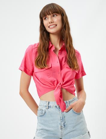 Önden Bağlamalı Gömlek Kısa Kollu Cepli Viskon Karışımlı
