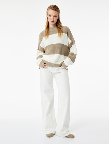 Uzun Kollu Bisiklet Yaka Renk Bloklu Triko Kazak