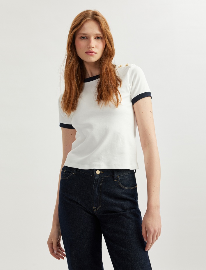 Pamuklu Kontrast Detaylı Düğmeli Bisiklet Yaka Kısa Kollu Tişört