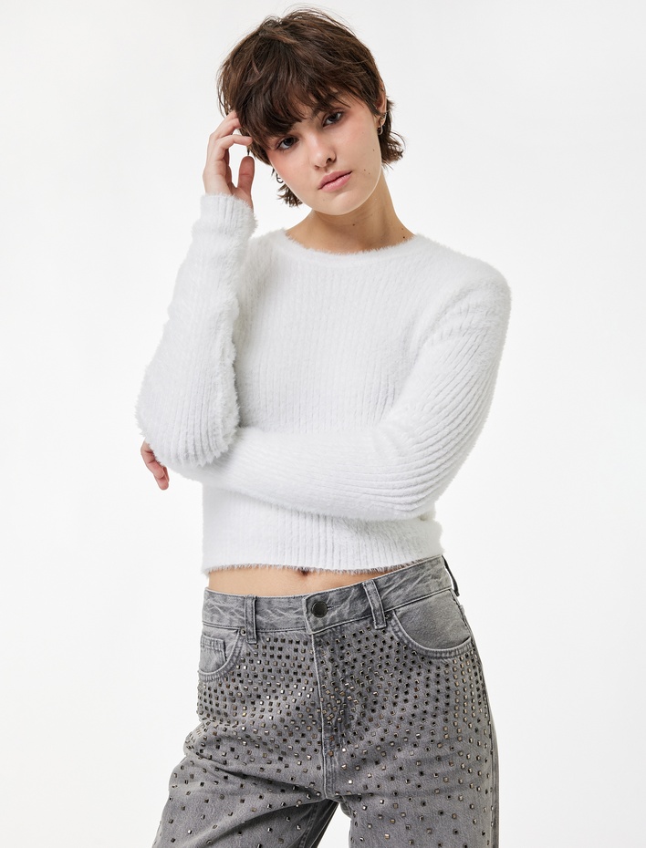 Uzun Kollu Bisiklet Yaka Slim Fit Dokulu Triko Crop Kazak